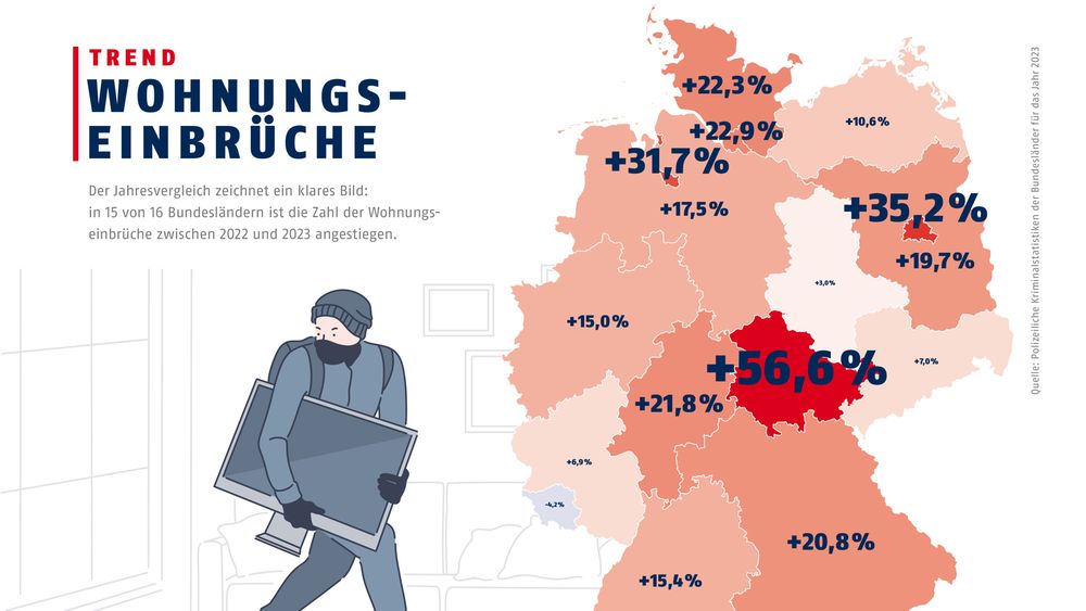 Mit Ausnahme des Saarlands ist in allen Bundesländern die Zahl der Wohnungseinbrüche in 2023 gestiegen, in Thüringen beispielsweise um 56 Prozent.